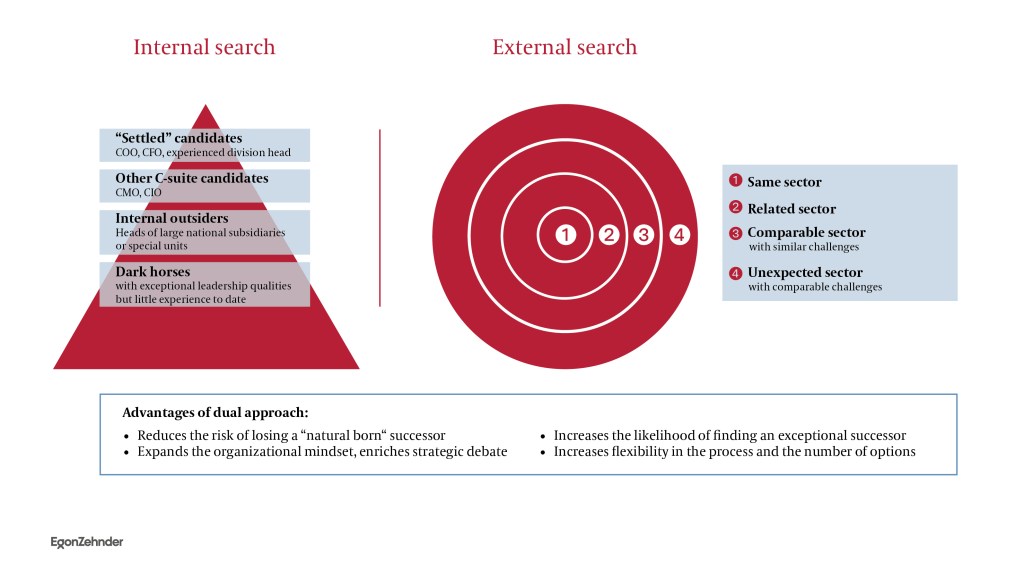 En promedio, los CEOs externos ofrecerán una perspectiva más amplia, mientras que los candidatos internos tendrán un conocimiento significativamente mayor sobre la empresa. Algunos estudios sugieren que los candidatos internos obtienen mejores resultados en términos de rendimiento para los accionistas que los CEOs traídos de fuera. Al mismo tiempo, la incorporación de un candidato externo puede resultar ventajosa en situaciones de cambio.
