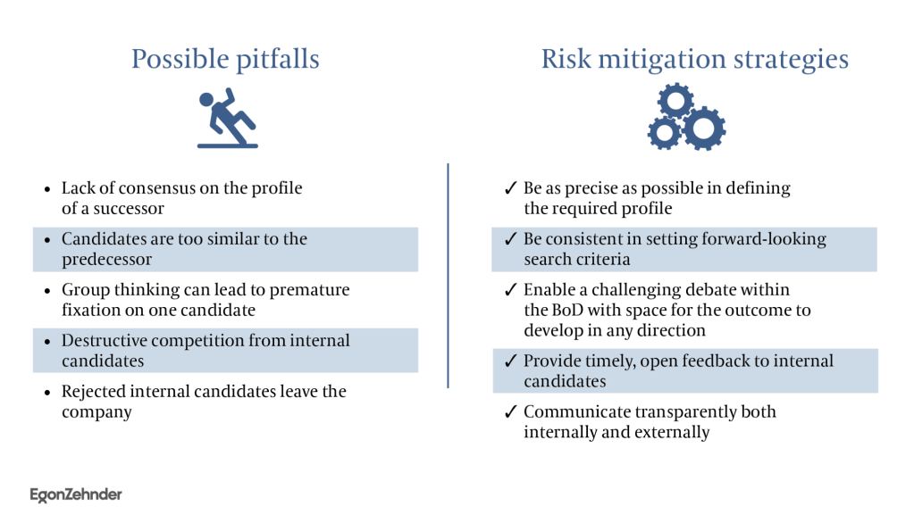 La experiencia ha demostrado que otro riesgo solo se puede contener de forma limitada: la competencia encubierta o incluso abierta entre varios candidatos internos. Que los candidatos se esfuercen por posicionarse en la carrera hacia el futuro primer puesto es inevitable y puede ser destructivo. La etapa final de la escalada puede hacer que aquellos que no se conviertan en directores ejecutivos abandonen la empresa. Desde el principio, el Consejo debe considerar la amenaza de daño si uno o más directores ejecutivos cercanos renuncian. La comunicación abierta con los candidatos a CEO internos es muy recomendable como mínimo, pero no es garantía de que los supuestos «perdedores» no opten por dejar la empresa para buscar nuevos desafíos en otro lugar.